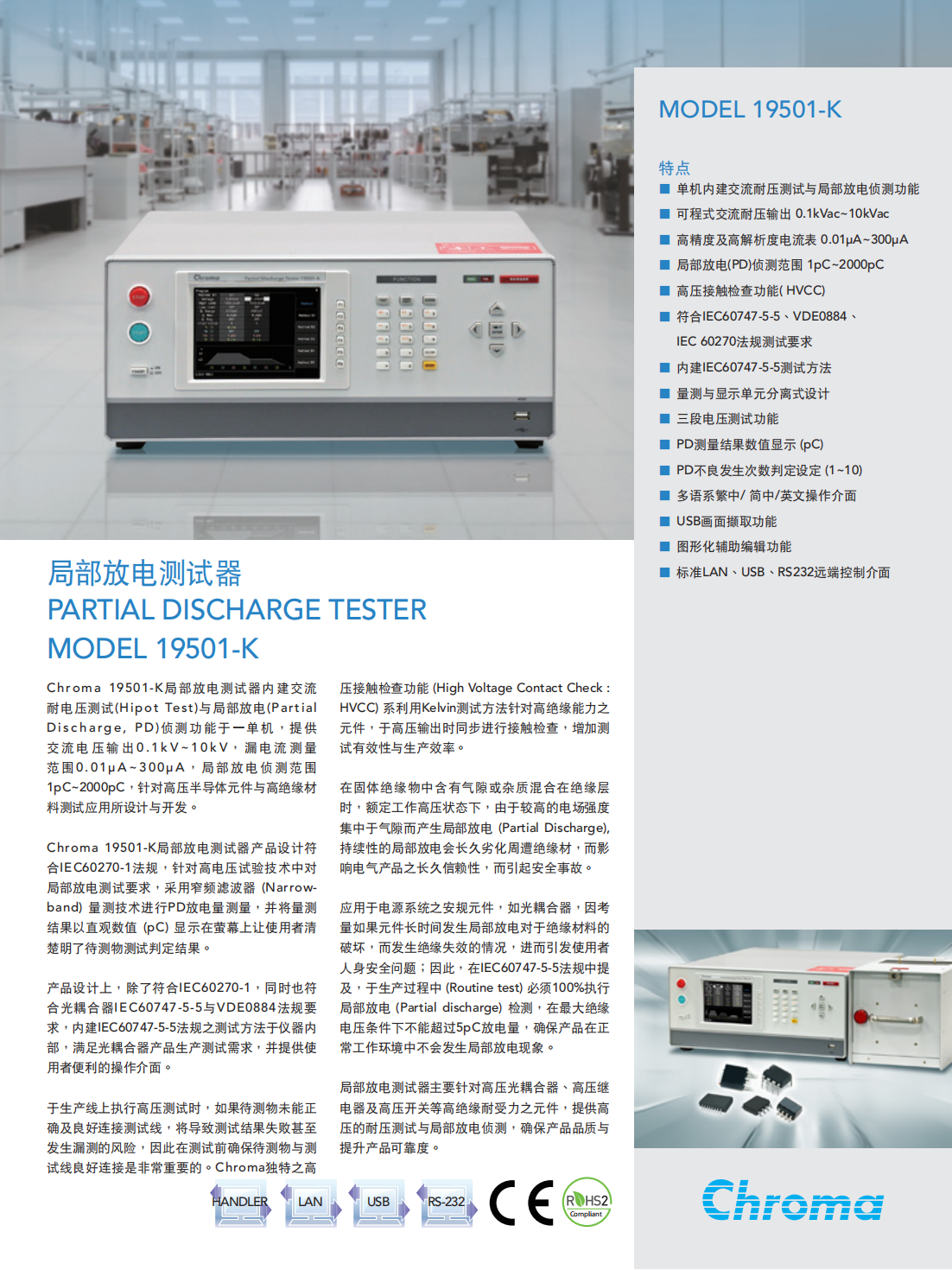 Chroma 19501-K局部放电测试器内建交流耐电压测试(Hipot Test)与局部放电(PartialDischarge,PD)侦测功能于一单机,提供交流电压输出0.1kV~10kV,漏电流测量范围0.01μA~300μA,局部放电侦测范围1pC~2000pC,针对高压半导体元件与高绝缘材料测试应用所设计与开发。